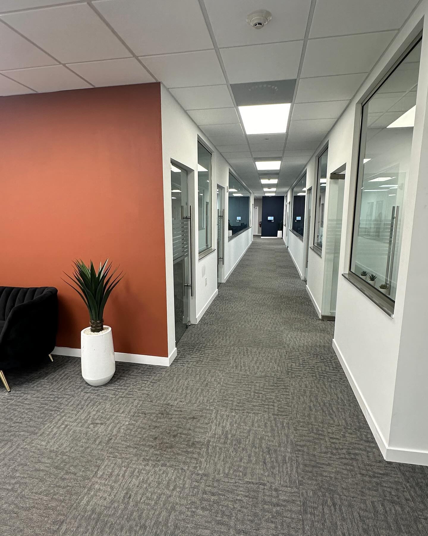 - Branding the Space While Maintaining Professional Flow: The company wanted a bold, modern brand presence without overwhelming the workspace. We achieved this by incorporating subtle brand colors, custom signage, digital displays, and feature walls that reinforced identity while preserving a clean, professional atmosphere employees could work comfortably in.